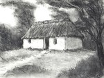 2017Losse studieschets in houtskool van een oud huisje in het bos met een rieten dak.