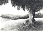 2016Losse houtskool studie tekening van een schaduw gevende boom in een open stuk weide.