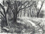 2016Houtskool tekening van een bospad met een sterk contrast tussen licht en schaduw.