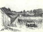 2016Tekening in houtskool van een oude houten boerderij aan de rand van een weide in houtskool